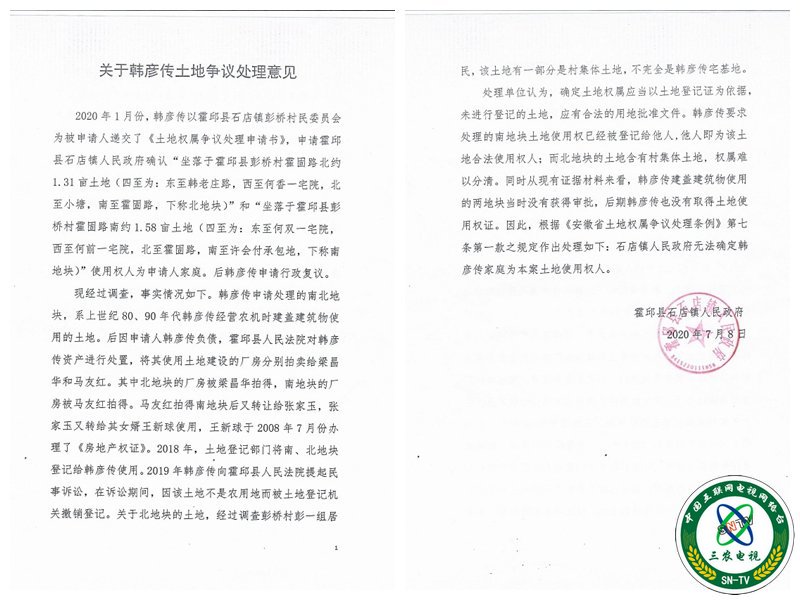 2019年,韩彦传曾向霍邱县自然资源和规划局提出确权申请,自然资源和规划局依据《安徽省土地权属争议处理条例》第30条规定,让乡镇人民政府处理。可是,石店镇政府又认为无法确认!