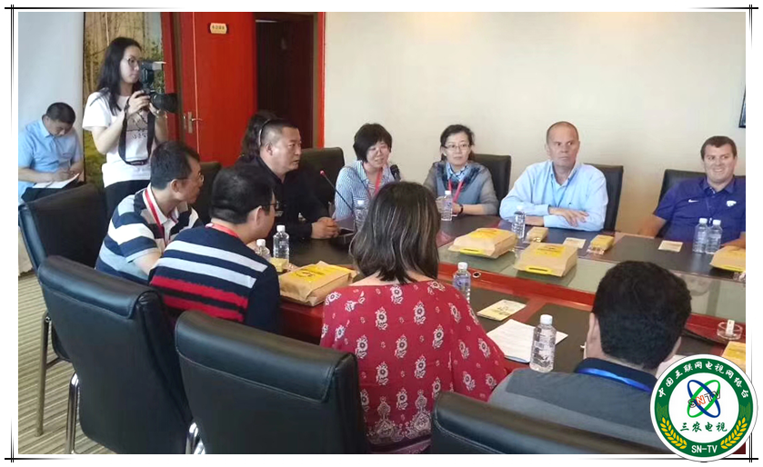王正义理事长(横排着黑色服装者)正在与国内外友人商谈扩大黄金玉米市场事宜