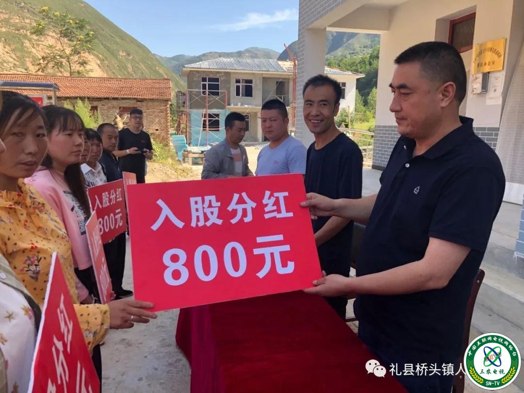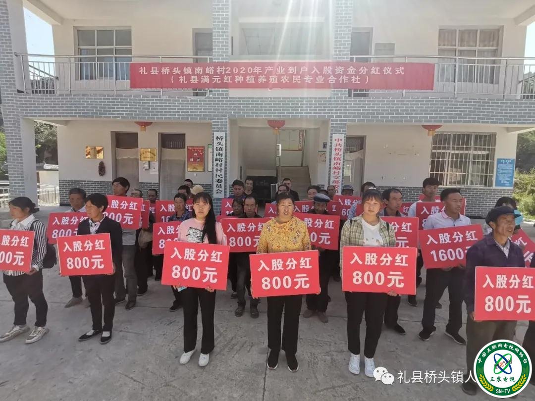此次分红仪式,菜花村总共分红100户80000元,其中礼县武斌绿色大黄种植农民专业合作社分红78户62400元,礼县民富强蛋鸡养殖合作社分红22户17600元。南峪村礼县满园红种植养殖农民专业合作社总共分红34户27200元。