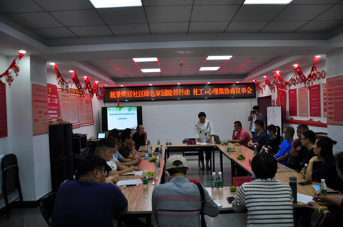 9月初,社区居委会将居民诉求上报梨园镇政府及杨庄街道,经批准,聘请第三方社会组织“北京市通州区春晓心理社会工作事务所”进驻社区,组建专项工作组开展工作。工作组进行入户走访、议事协商、民意征集等工作,经居民提议、第三方实地勘察、专家研讨,分别于9月20日、27日召开了“靓景明居社区绿色家园和睦行动-社工+心理微协商议事会”,杨庄镇、社区居委会、社区专家、第三方专业社会工作机构、物业公司、居民代表参加会议,广泛听取居民意见和建议,客观合理协商。