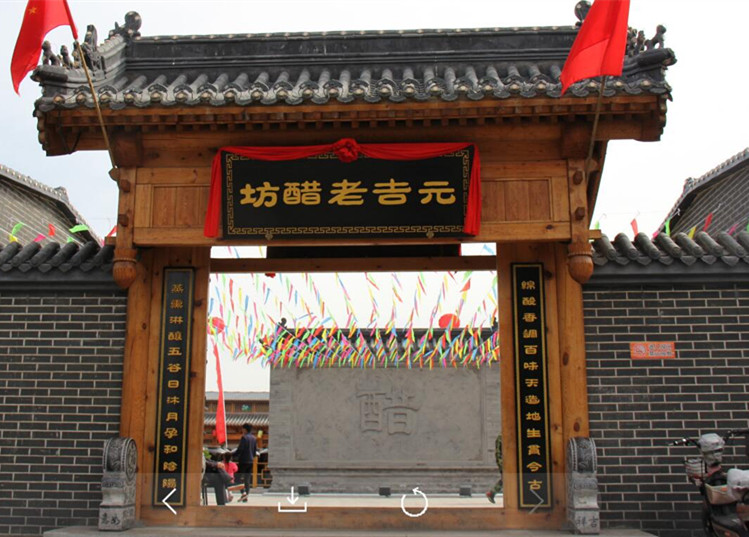 千百年来,元吉老醋坊秉持着传统古法的制作流程,并一直延续着诚信经营的忠义精神,对老醋的古法酿造有了更进一步的挖掘和发扬。新建的元吉老醋坊,整体构建还原了明清建筑风格,青砖,灰瓦,古木雕刻。生产上完全还原古法酿造工艺,从酿醋原料到老醋成品,一步步再现了古代酿醋场景。