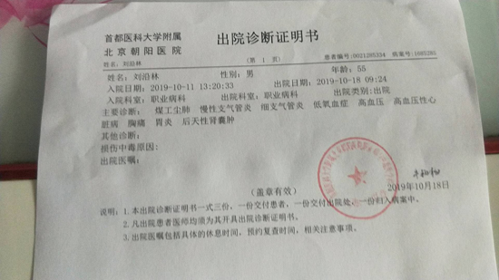 我拿2019年10月份北京朝阳医院出具的煤工尘肺的诊断证明书都不好使,不给诊断书,推到沈阳医学会,鉴定要材料鉴定费。2020年6月22日,通知单到内蒙古海州露天矿,还推脱。到2020年9月4日,煤工尘肺病复发,我又住进阜新市中心医院。我在拿病、拿命等诊断书。