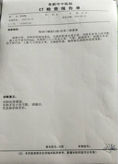 2019年6月18日,到首都医科大学附属北京朝阳医院门诊CT检查。图像出来了,门诊大夫宋某果专家让我看看,说哪来的肺癌,是煤尘肺,碳末肺。