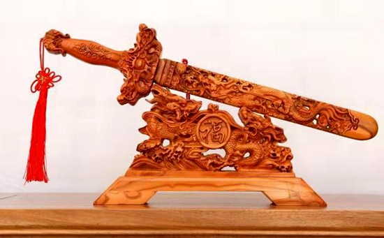 桃木木质细腻,木体清香。因其为避邪镇宅之神物,而深得文人雅士之宠爱青睐,故常雕之成剑,或佩于身或悬于室,以示其高雅风范。